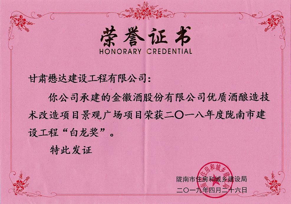 近日,在隴南市2019年建設(shè)工程質(zhì)量安全監(jiān)管工作視頻會(huì)議上,公司承建的金徽酒股份有限公司優(yōu)質(zhì)酒釀造技術(shù)改造項(xiàng)目景觀廣場(chǎng)項(xiàng)目榮獲2018年度隴南市建設(shè)工程“白龍獎(jiǎng)”。