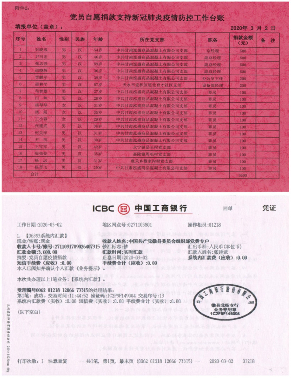 為積極響應(yīng)黨中央對(duì)廣大黨員的號(hào)召,表達(dá)對(duì)新冠肺炎疫情防控工作的支持,3月2日,甘肅泓盛商品混凝土有限公司黨支部組織開(kāi)展抗擊疫情自愿捐款活動(dòng)。全體黨員支持疫情防控斗爭(zhēng)愿望強(qiáng)烈,紛紛踴躍捐款。支部18名黨員(含預(yù)備黨員)共計(jì)捐款3600元,已按組織程序上繳中國(guó)共產(chǎn)黨徽縣委員會(huì)組織部黨費(fèi)專戶。
