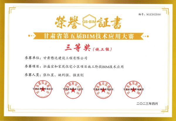 近日,從甘肅省建筑業(yè)數(shù)字化轉(zhuǎn)型峰會暨2022年甘肅省第五屆BIM技術(shù)應(yīng)用大賽傳來喜訊,由公司BIM小組申報的泓盛宜和家苑住宅小區(qū)項目施工階段BIM技術(shù)應(yīng)用榮獲大賽施工組三等獎。