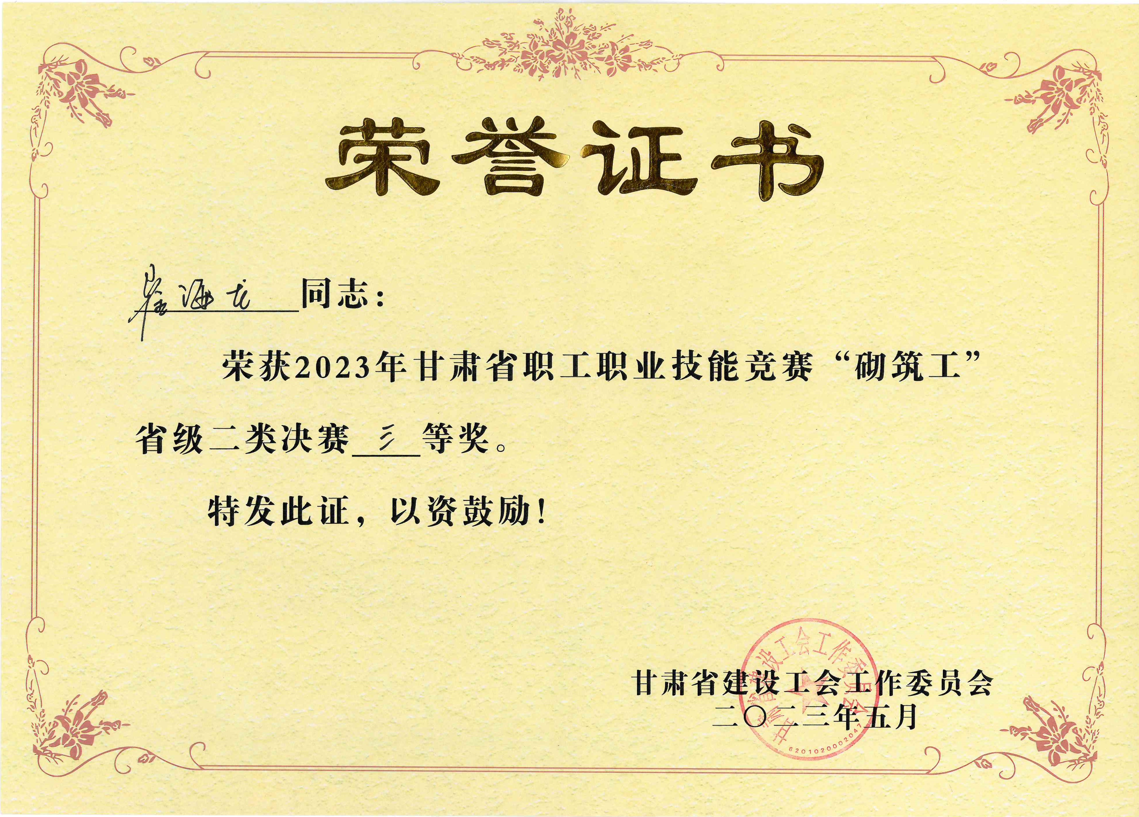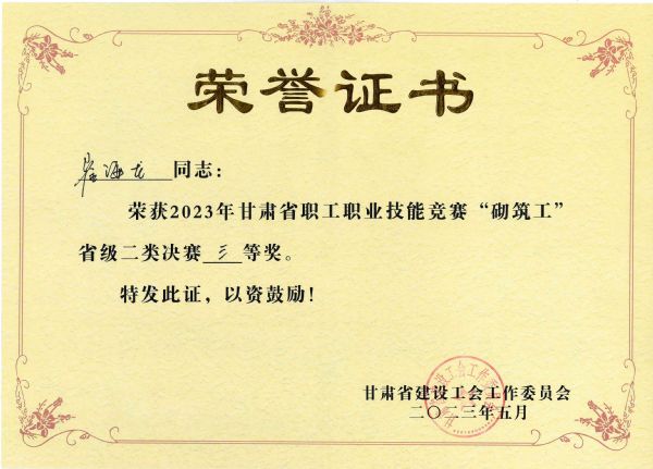 5月16-17日,2023年甘肅省職工職業(yè)技能競(jìng)賽“砌筑工”省級(jí)二類(lèi)決賽在天水市舉行,懋達(dá)建設(shè)崔海龍、胡三桂在全省多家建筑企業(yè)層層選拔的39名選手中脫穎而出,分別獲得三等獎(jiǎng)、優(yōu)秀獎(jiǎng)的好成績(jī)。