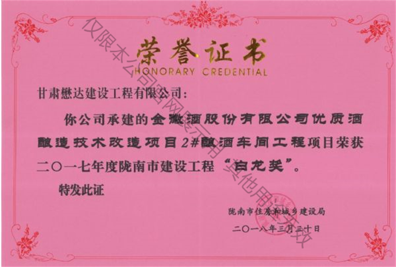 金徽酒股份有限公司優(yōu)質(zhì)酒釀造技術(shù)改造項目2#釀酒車間工程--2017年度隴南市白龍獎