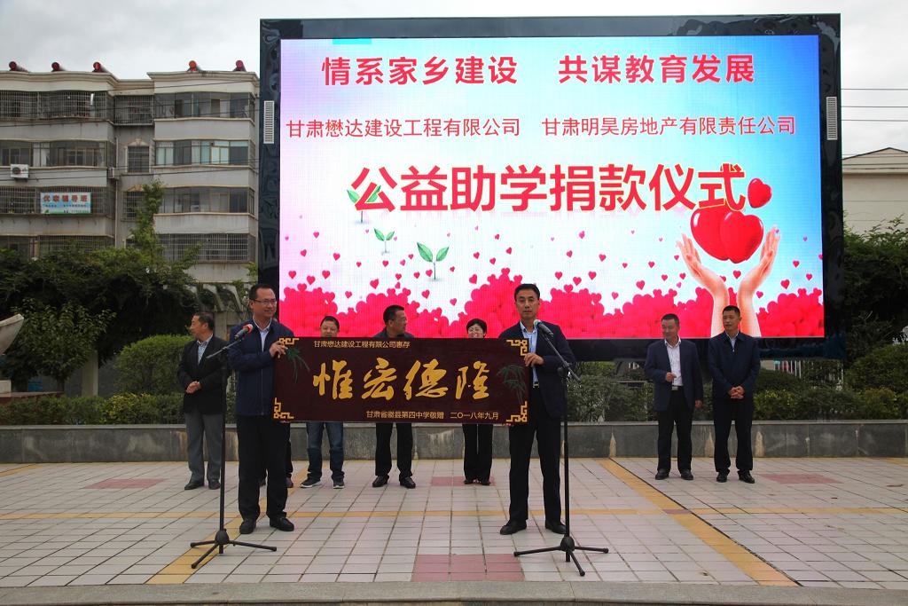 9月26日,“情系家鄉(xiāng)建設(shè) 共謀教育發(fā)展”公益助學(xué)捐款儀式在徽縣四中隆重舉行?h委、縣政府、縣教育局有關(guān)領(lǐng)導(dǎo)及四中全體師生參加捐款儀式,公司總經(jīng)理封曉成、副總經(jīng)理尹向宏出席捐款儀式。