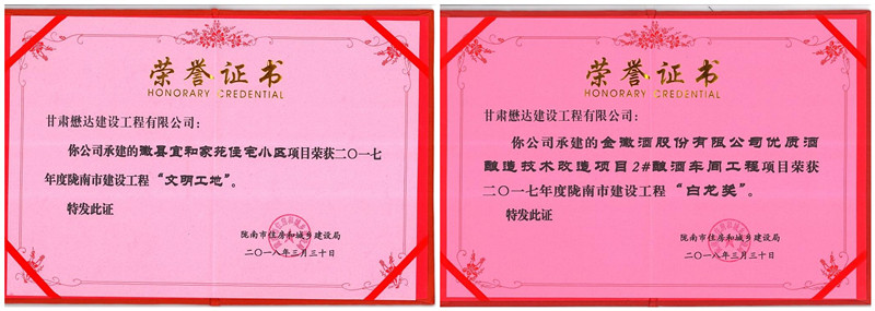 3月30日召開的隴南市2018年建設(shè)工程安全質(zhì)量監(jiān)管工作會議上,公司承建的金徽酒股份有限公司優(yōu)質(zhì)酒釀造技術(shù)改造項(xiàng)目2#釀酒車間工程項(xiàng)目榮獲2017年度隴南市建設(shè)工程“白龍獎”,同時徽縣宜和家苑住宅小區(qū)項(xiàng)目榮獲2017年度隴南市建設(shè)工程“文明工地”。