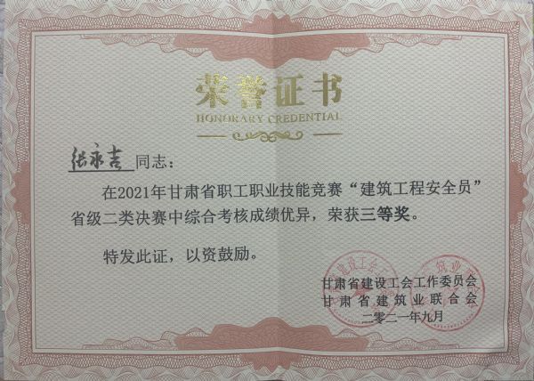 近日,2021年甘肅省職工職業(yè)技能競(jìng)賽“建筑工程安全員”省級(jí)二類(lèi)決賽在蘭州新區(qū)成功教育園項(xiàng)目舉行。公司選派安全員張永吉、張宏明參加競(jìng)賽。