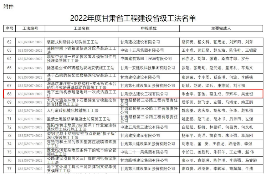 6月20日,甘肅省住房和城鄉(xiāng)建設(shè)廳下發(fā)文件《甘肅省住房和城鄉(xiāng)建設(shè)廳關(guān)于公布2022年度甘肅省工程建設(shè)省級(jí)工法的通知》(甘建質(zhì)〔2023〕127號(hào)),公司《地下室結(jié)構(gòu)板耐磨地坪一次成活施工工法》,根據(jù)《甘肅省工程建設(shè)工法管理辦法》(甘建工〔2016〕152號(hào)),省住建廳評審,經(jīng)公示無異議,獲評2022年度甘肅省省級(jí)工法。